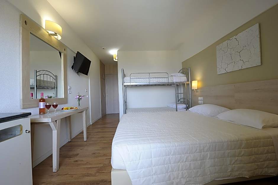 This air-conditioned family room is consisted of of a flat-screen TV with satellite channels, a private bathroom as well as a balcony with garden views. The unit has 3 beds.
